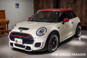 ペッパーホワイトにレッドルーフ、WORKのホイールがクラシカルなレーシングMINIの雰囲気をまとっています。