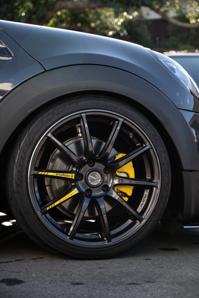 フロントリップ&RAYSホイールでインパクトのある足回りにイエローに塗装されたキャリパーがオシャレな一台。