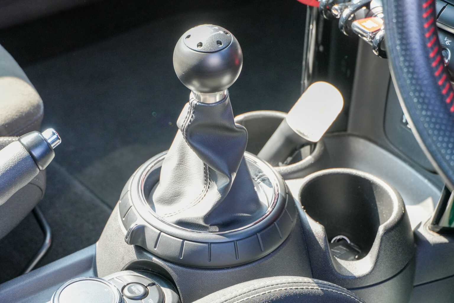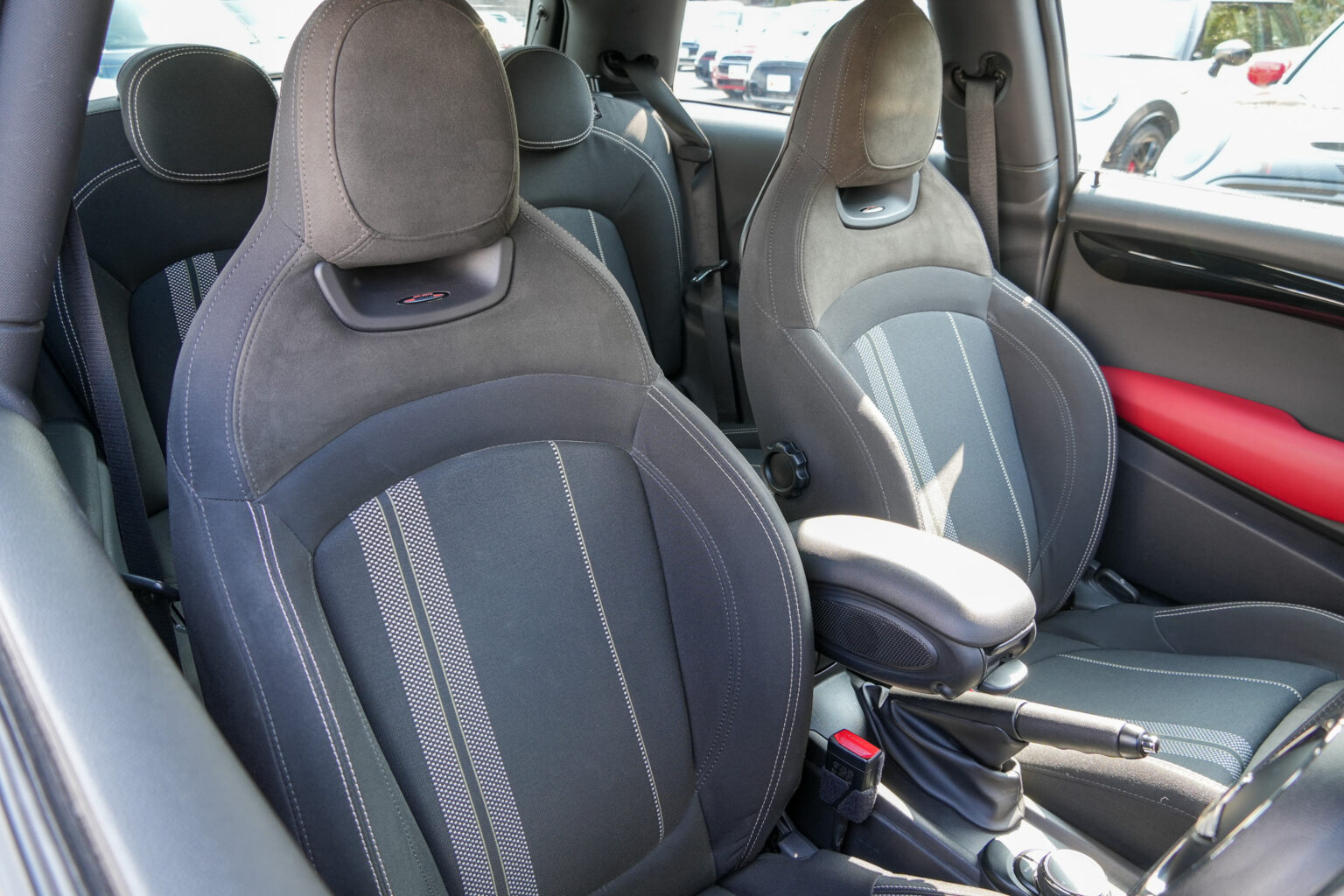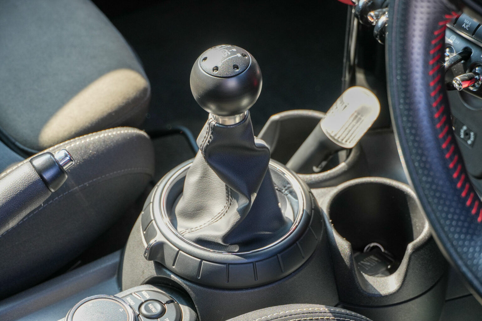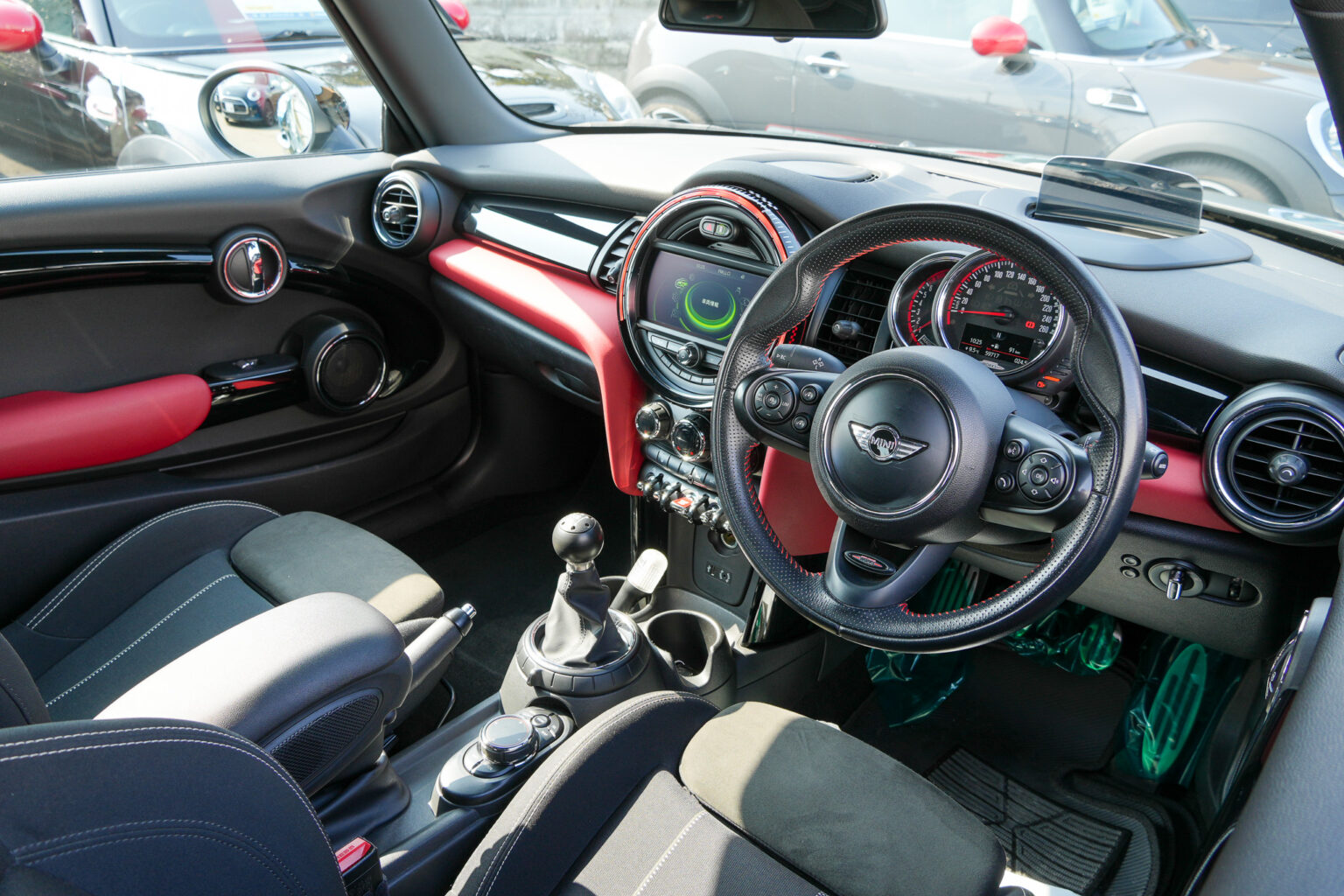 シフト周りはクーパーS用のシフトノブへ変更しつつ大人気の「クレイブンスピード」のシフトノブを装着! コクコクと決まるシフトフィーリングがさらに楽しくなる…まさにJCWにふさわしいコックピットが完成しました。